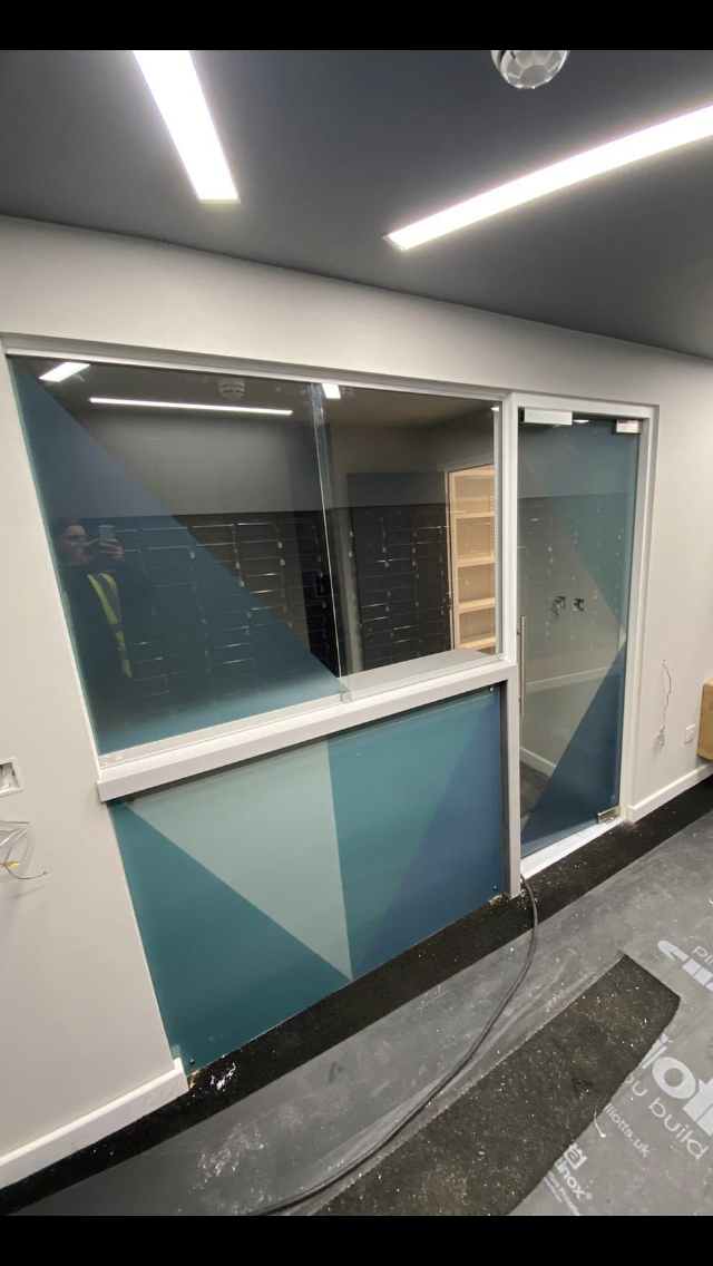 Southern Glass recently installed a set of toughened glass sliding hatch way doors for a Southampton based University Controlled building. The main glass door features a magnetic locking mechanism for increased safety. Southern Glass surveyed and fitted the items to the clients prepared opening. We included the coloured glass film design applied to the surfaces all as the customers design specifications.